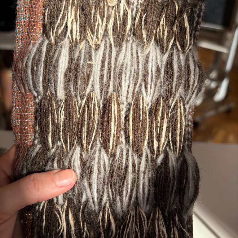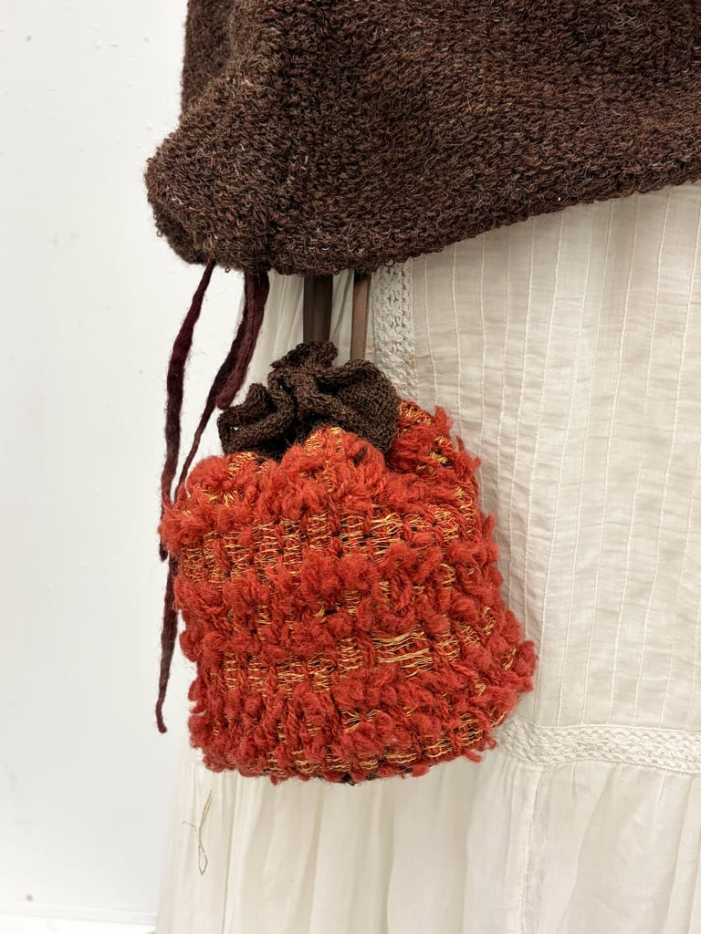 Faced with the structural constraints of the dobby loom's loose and narrow weaving width, I engineered a customizable draw-string reticule bag inspired by the V & A's rich and extensive collection of 18th century "pocket" bags. By mixing knitted and woven fabric I designed a simple cylindrical bag with an 8" x 18" swatch, shaping it through wet and dry felting as well as dying the fabric with madder root.
